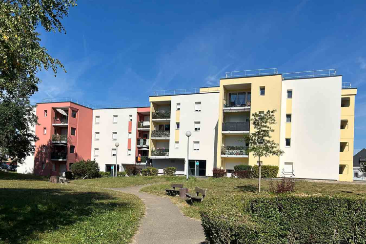 Située rue du Vieux Chêne à Sarreguemines, cette opération de rénovation porte sur un ensemble de 75 logements collectifs sociaux en R+3. Dans le cadre de ce projet, Les Zelles ont assuré la fourniture et la pose de 443 fenêtres PVC ainsi que de 425 volets roulants intégrés, en blanc teinté dans la masse RAL 9016.
